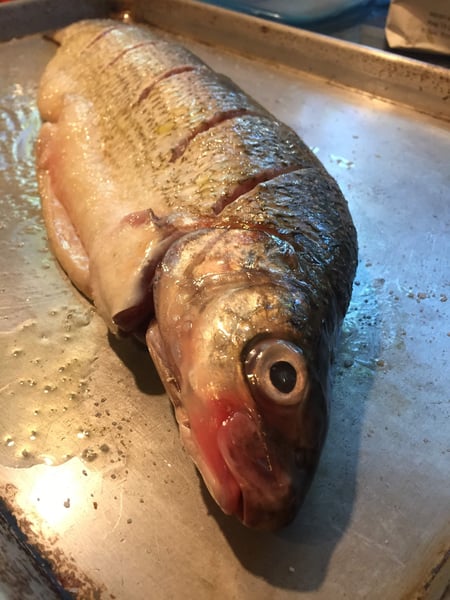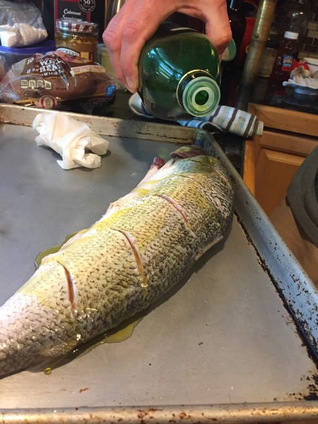 You definitely want to be sure to season the cavity of the fish with salt and pepper, too. As an optional step, you can place a few lemon slices and sprigs of fresh herbs in the cavity.