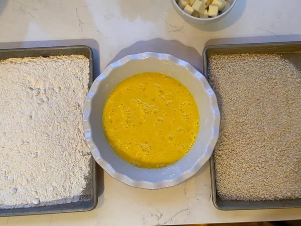 - A 3-step breading station. Measure your flour, eggs and panko breadcrumbs in three separate, shallow dishes.