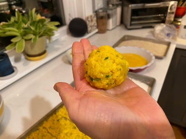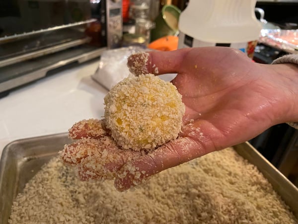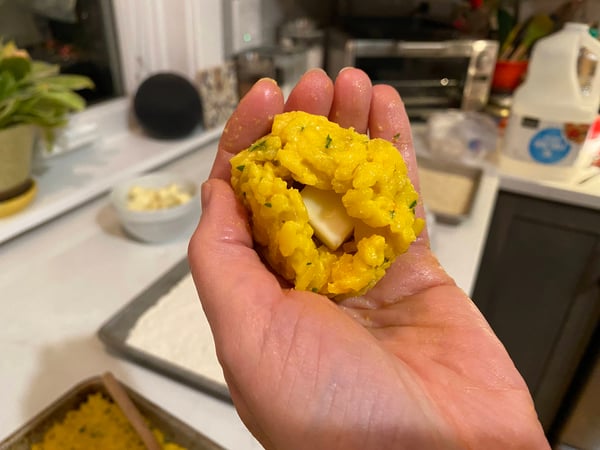 Envelope the cheese with the rice, and roll into a tight ball. In order to be more efficient in your kitchen, form all of the balls before moving onto the breading step.