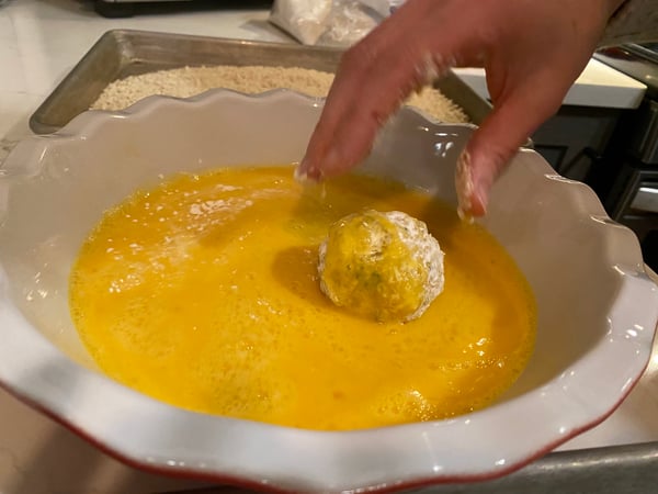 Transfer the floured arancini to the eggs, and use your other hand, the one that will be dedicated to just handling the eggs, and evenly coat the balls.
