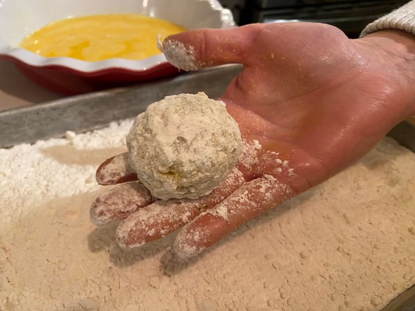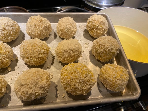 - To dredge the arancini, roll a few balls at a time in the flour, coating them well. Transfer to the egg wash and then roll in the panko breadcrumbs until evenly coated. Transfer to a plate or sheet tray.