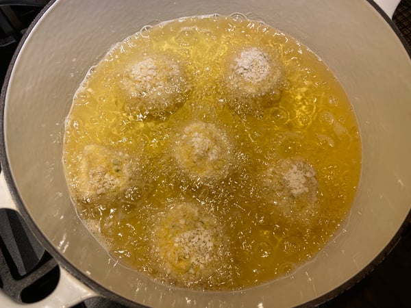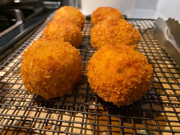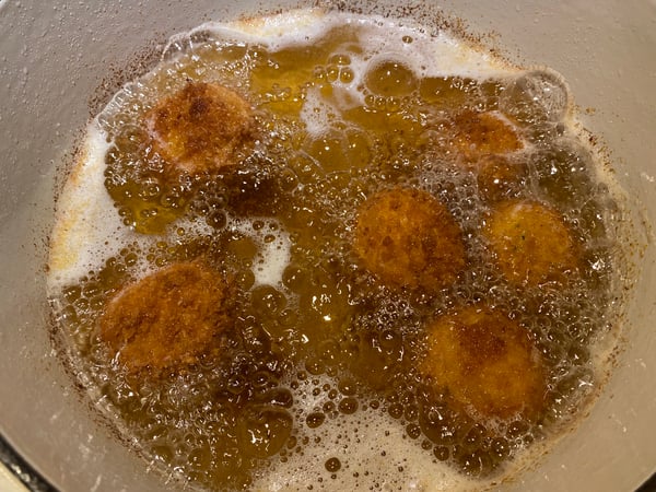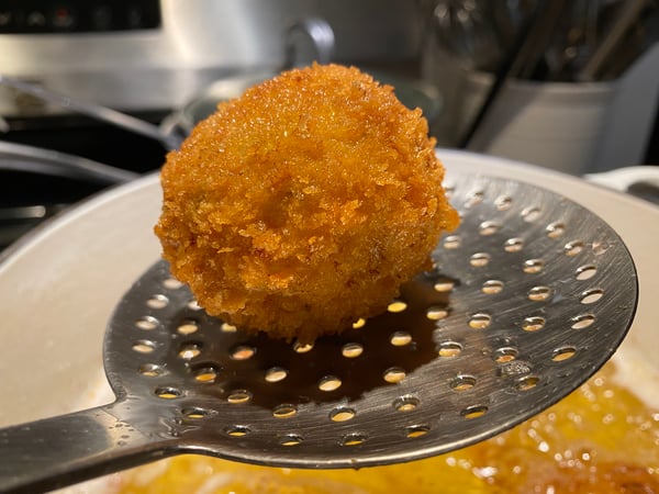 Fry the fritters, turning once during the process, until the breadcrumbs are golden brown. Transfer the arancini to your landing pad, and continue to fry.