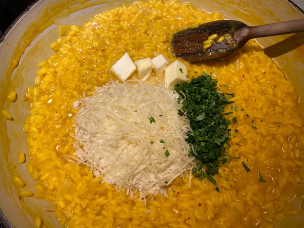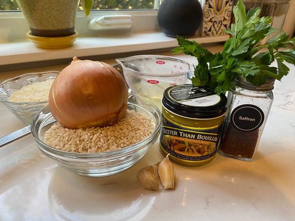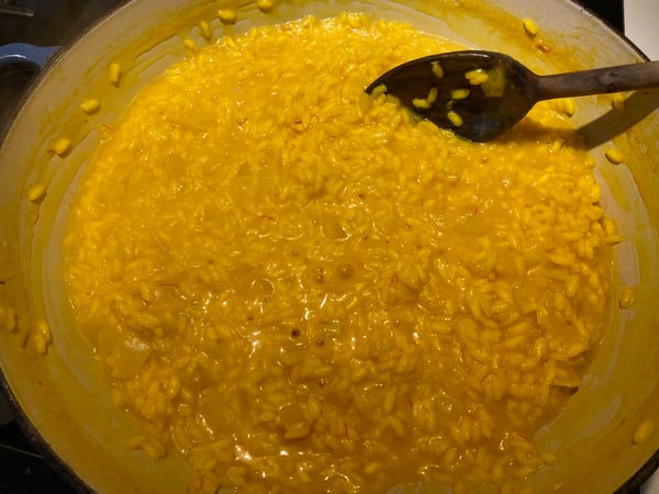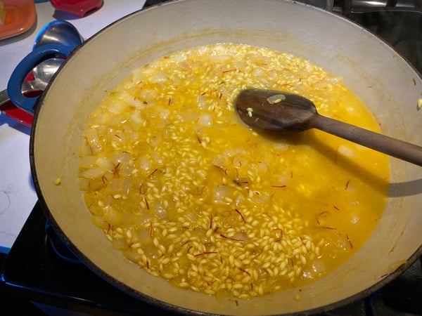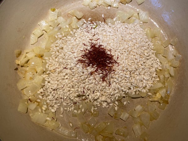 - Stir in the arborio rice and saffron and cook, stirring frequently, to toast the grains.