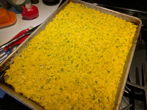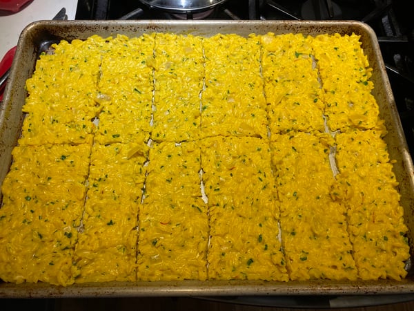 - Spread the risotto out on a sheet tray, in a thin even layer, and refrigerate until cold.
