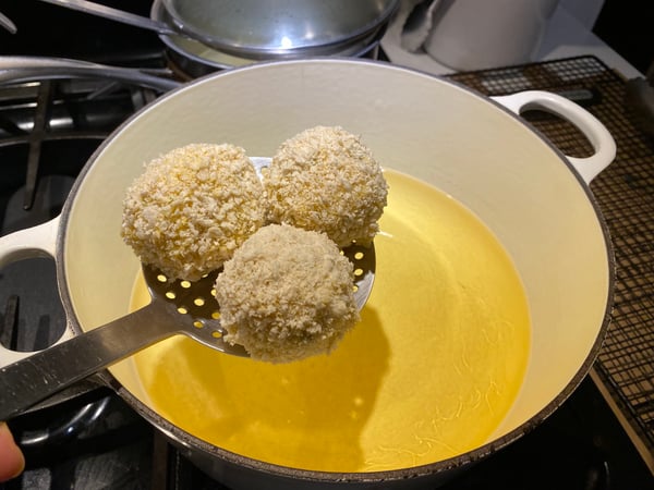 Place 2 to 3 arancini at a time on your slotted spoon or skimmer, and gently lower into the oil.