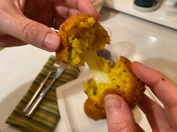 Is this a lot of work? Yes. Is it worth it? 100%! It was a Sunday afternoon/evening when I made them at home and had so much fun… maybe that was due in part to the steady flow of red wine while cooking, but I genuinely loved the whole process of creating these Sicilian snacks. Biting into a freshly fried and crispy arancini and finding the melty cheese center made me forget about all of the dirty dishes in the kitchen.