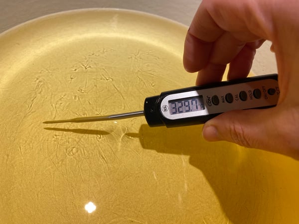 - Your pot of oil heating. Fill a deep, heavy pan such as a French oven just below the halfway mark with a neutral oil such as canola or vegetable. Using a deep fry thermometer (a very important tool to have!), slowly heat the oil until it reaches 325°.