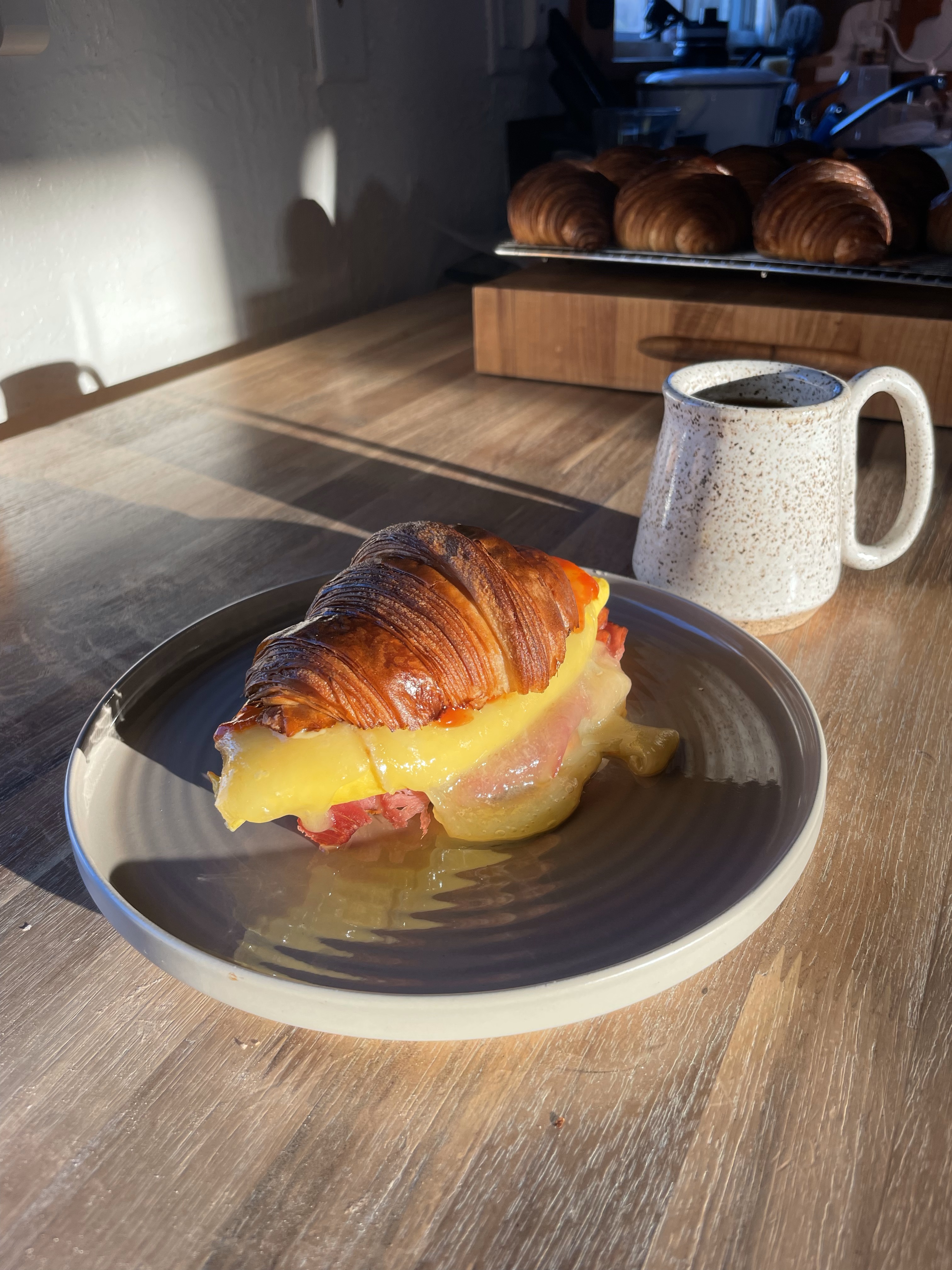 Keeping this in mind, my breakfast sandwich will stick to the four components of the original, but just switch them up a little. It will have a bread element, a cured meat element, an egg element, and a cheese element (plus condiments). For the bread, instead of using an English muffin I'll use a croissant. I’ve been making a lot of croissants recently (more on that in a later post), so I did happen to have a few lying around, but any good croissant will do well here.