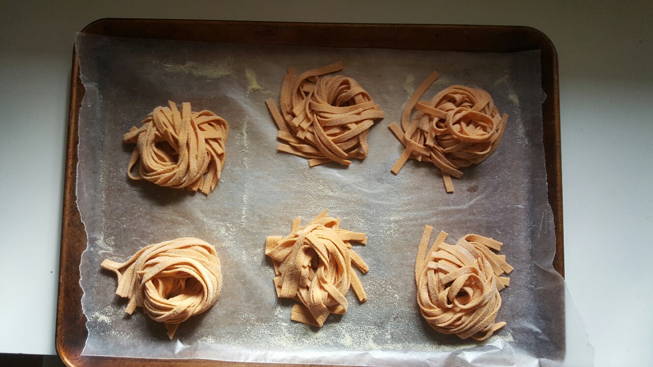 After you have cut all of your pasta and have them formed into nests, lightly sprinkle a little more semolina on the pasta. If you are ready to cook your pasta, place the pasta into salted boiling water and cook for 2-3 minutes. Drain and toss with your favorite sauce.