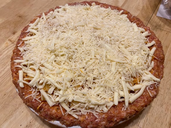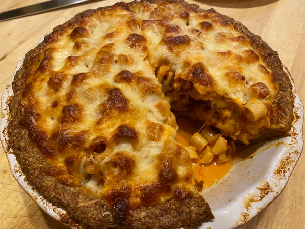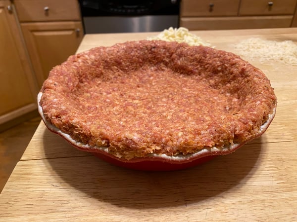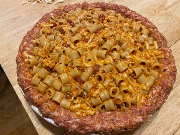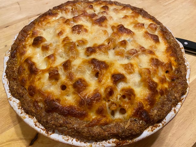 I lined the bottom and sides of a pie dish with about 1/4-inch layer of the sausage, and then filled it with cooked noodles (I used short noodles but you can use long if you prefer), tossed with tomato sauce and grated mozzarella and parmesan cheeses.
