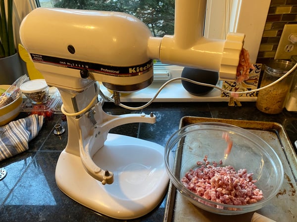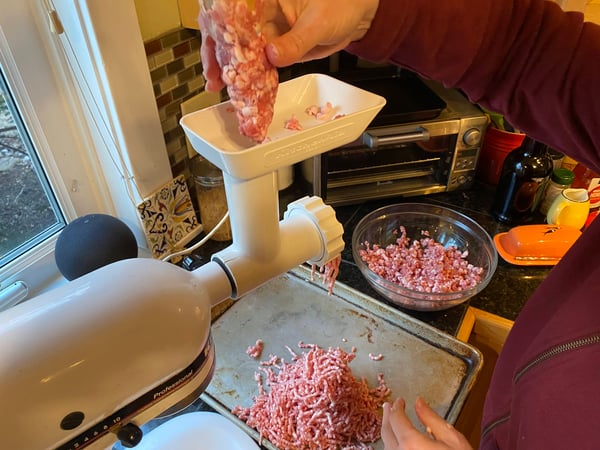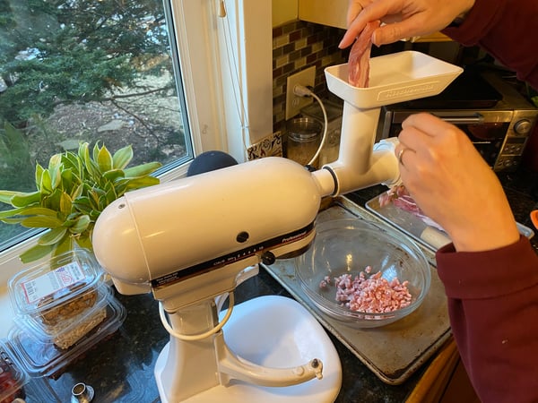 - If using a stand mixer attachment, set it on the highest speed, and feed each strip of cold pork through the grinder, using the plunger to help push the meat through. When done, feed a piece of plastic wrap through the grinder to ensure all of the pork has been pushed through.