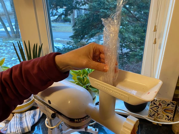 3. To make sure all of the meat has passed through the grinder, do what the pros do. Take a piece of plastic wrap and thread it through the grinder. This will push any remaining meat through the plate without shredding the plastic. It’s a tried-and-true trick!
