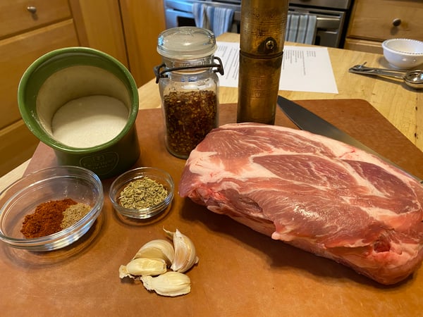 Boneless Pork Butt: This muscle comes from the shoulder and should be used for sausage making due to its ideal lean-to-fat ratio, which is about 70%-30%. It’s this fat that adds that juiciness to the sausage and prevents it from drying out when cooked. The extra fat also adds a bunch of flavor! Side note: You can use pre-ground pork to streamline, but that only contains about 20% fat and that extra 10% from the butt makes a really significant difference.