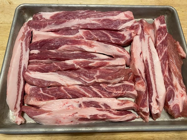 1. Cut your pork butt into long strips, place them on a sheet tray and set that tray in the freezer for about 30 minutes. This will firm up the fat ensuring it does not shmear.