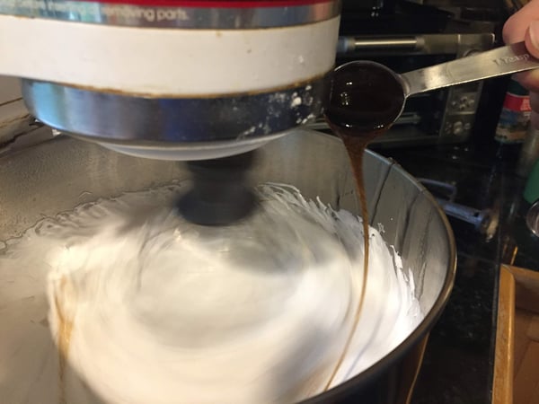While the sugar is cooking to soft-ball stage, start whipping your egg whites in the bowl of a stand mixer until frothy. Once the sugar has reached the correct temperature, slowly pour the hot syrup into the bowl of whipped egg whites while mixing on medium speed.