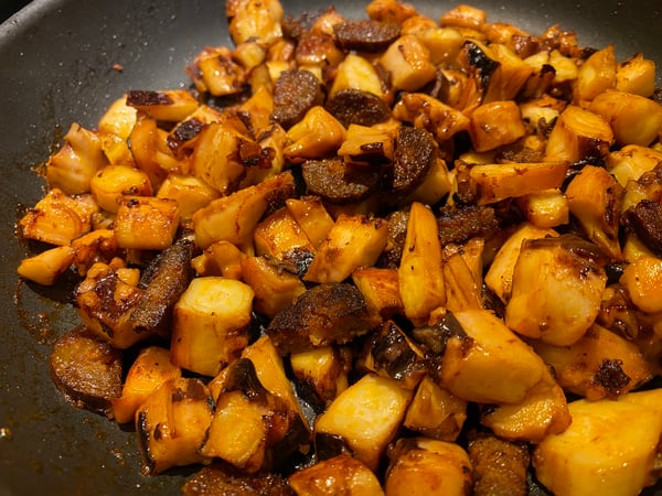 6. Transfer the octopus and chorizo to the bowl with the potatoes, and dress with just enough of the vinaigrette to coat.