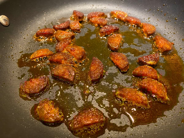 5. Heat a nonstick sauté pan over medium heat, and add the oil. Sauté the chorizo until golden brown and crisp, and then add the octopus, tossing occasionally, until caramelized around the edges. Season with salt and pepper to taste.