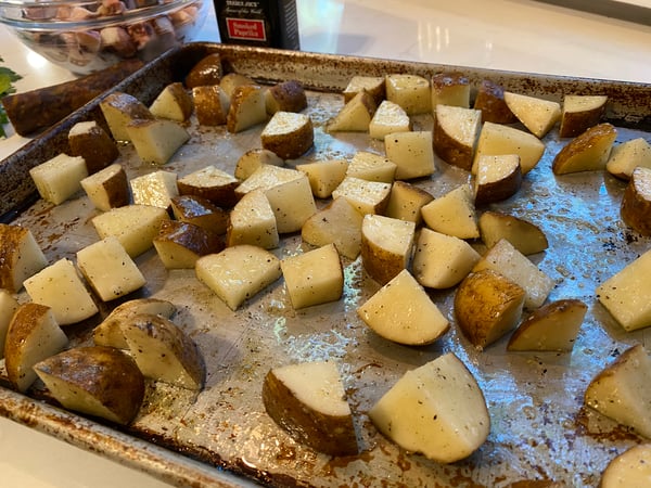 - On a sheet tray, toss the potatoes with the olive oil, and season with salt and pepper to taste. Roast until they are golden brown and crisp, 35 to 40 minutes. Remove from the oven and place in a serving bowl.