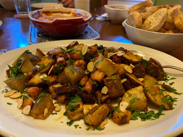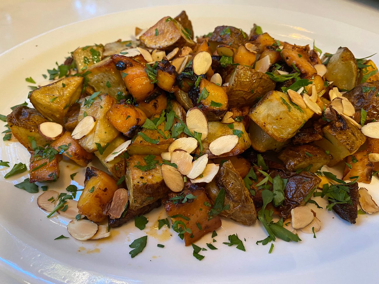2. On a sheet tray, toss the potatoes with the olive oil, and season with salt and pepper to taste. Roast until they are golden brown and crisp, 35 to 40 minutes. Remove from the oven and place in a serving bowl.