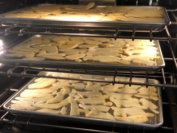 4. Dehydrate in the oven approximately 3 to 4 hours. It could take longer; this will depend on how thick you slice the ginger. The thicker it is, the longer it will take. Most likely your ginger will be sliced at slightly different thicknesses so some pieces will dry before others. After about 2 hours check your ginger and remove the pieces that are dried, if any. Keep checking every 20 to 30 minutes or so and remove the pieces as they dry. You will know they are dry when they are brittle when you try to bend them.