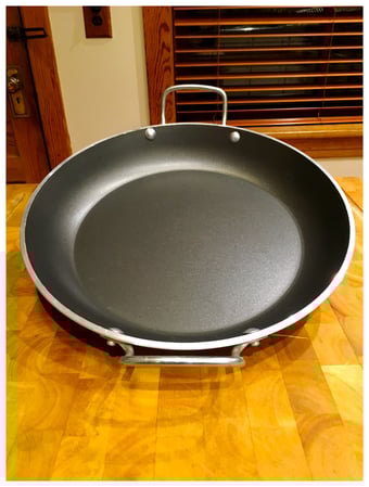 I’ve since purchased two more paella pans. The first one I purchased was one from a housewares store that specializes in high-end cookware and furnishings. It has a non-stick coating, which is something that I didn’t expect in a paella pan. It’s made of thick non-stick aluminum with multiple layers of non-stick coating. It’s very heavy in feel and also has the sloped sides and the wide flat cooking surface that traditional paella pans are known for. This pan has and still serves me very well when I have a paella party.