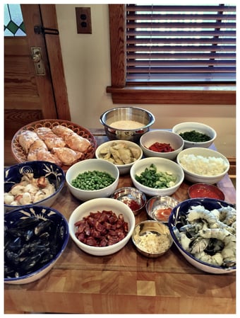 We offer several cooking classes at The Chopping Block where paella recipes are featured as a main course. One of those classes is called Tapas Party. Not only do we teach our students how to make several tasty tapas, we also teach students how to make a tasty and hearty paella dish. When we make paella, we use a Le Creuset pan that is made of heat-retaining cast iron with a enamel interior that aids in the development of the soccarat. We love using these pans because of its even heat distribution, heat retention and heavy, tight sealing lids.