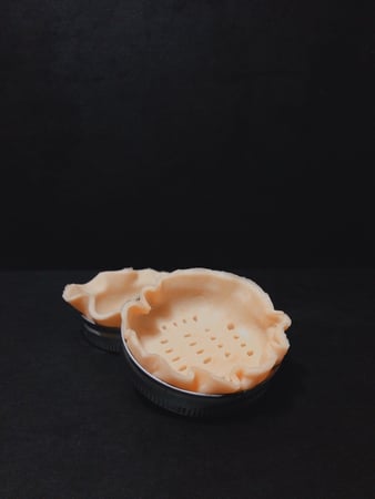 Once you’ve finished with that step, STOP and look at your lid. It’s crucial that you pop out the circular plate and flip it over so the rubbery side is now facing the bottom. You want the bottom of your pie dough to be touching the metal side of the lid like this: