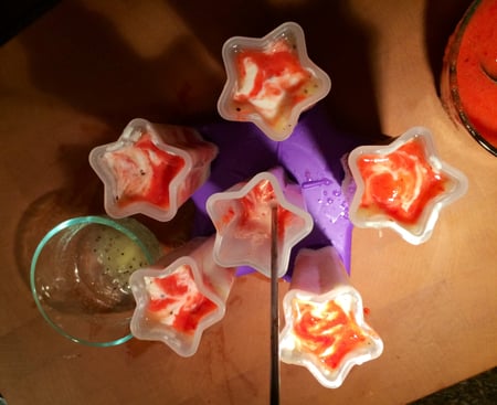 Sweeten 1 1/2 cups of yogurt to taste, and transfer to a piping bag for easy mold filling. I used non-fat greek yogurt for its low water content (more water = an icier pop), and rich mouthfeel. Fill your molds by alternating thin layers of the yogurt and purees and gently swirl with a skewer to create a marbled effect. I'm using the Tovolo Star Popsicle Molds that we carry at The Chopping Block.