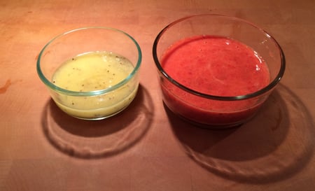 Start with about two cups of overripe fruit. I had about a third of a pound of bruised strawberries and one very squishy golden kiwi.