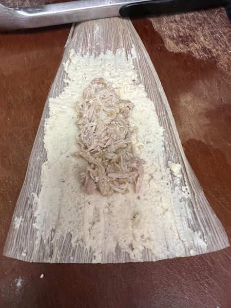- Place a heaping tablespoon of the filling into the center of the corn husk. Don't put too much filling or it will overflow when you close it.