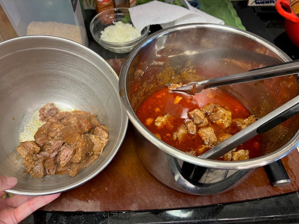 4. Add about 1/2 cup of the red chile sauce and the crushed tomatoes.