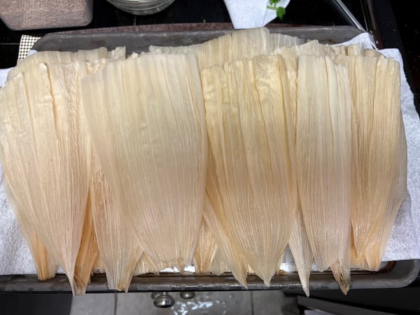 - Rinse and soak corn husks in hot water for an hour. Drain the corn husks and lay them flat onto a baking sheet lined with paper towels.