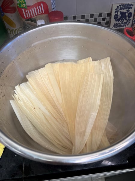 Now that you have your fillings done, it's time to focus on the tamales! First, you need to rinse and soak the corn husks in warm water for at least an hour. I used the largest stainless steel bowl I had since I needed to soak about 30 corn husks of varying sizes.