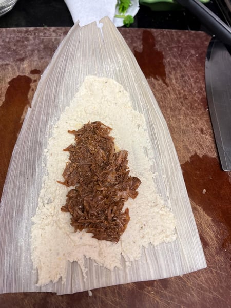 3. Place a heaping tablespoon of the filling into the center of the corn husk. Don't put too much filling or it will overflow when you close it.