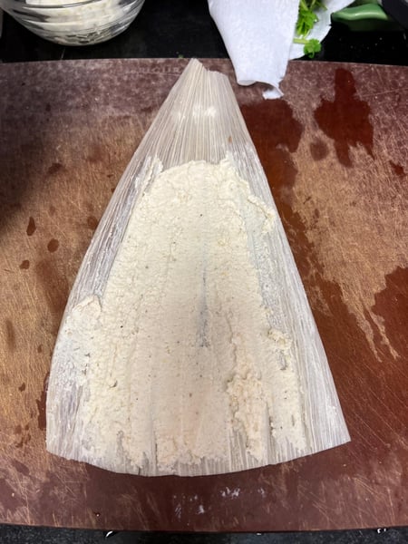 - Grab a corn husk and identify which is the smooth side and which is the side with ridges. Place the smooth side face up on your cutting board. Using a large spoon, grab a heaping spoonful of masa and place it in the middle of the corn husk. Using the back of the spoon, spread the masa in a thin layer to create rectangle shape, leaving the top 1/3 of the corn husk empty.