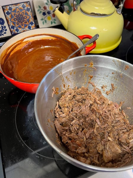 7. Shred the pork and discard fatty pieces. Toss with about 1 cup of the red chile sauce. You will have a little bit of sauce leftover, so find another use for it (like Taco Tuesday!) or freeze.