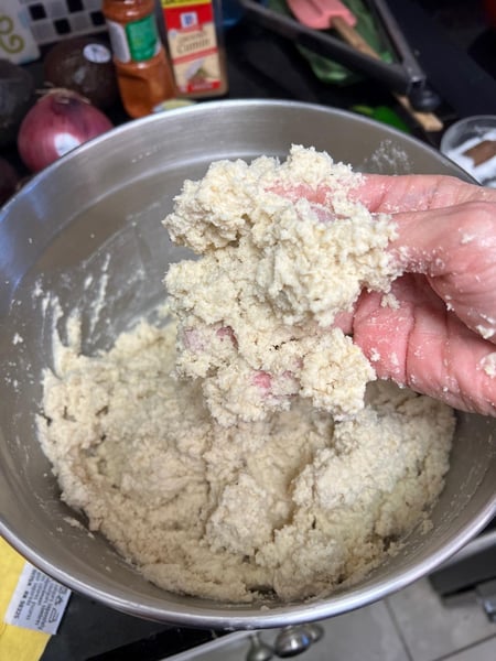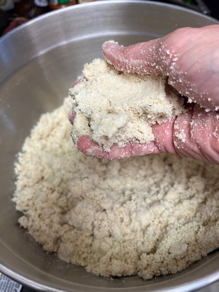 - Add oil and mix together with your hands, working the dough through your fingers until everything is well combined and incorporated. The dough should feel like wet sand and should lightly hold its shape when pressed together.