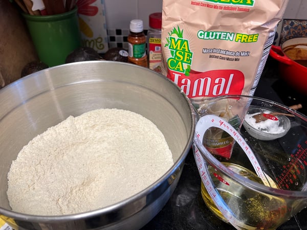 1. In a large mixing bowl, add the masa, salt and baking powder. Combine with a whisk.