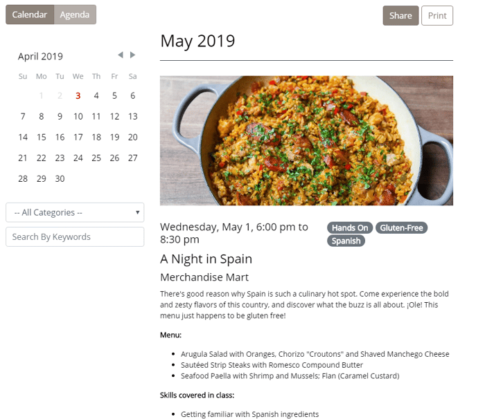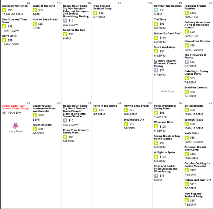 As with all software launches, there will be a transition period as we tweak the features to better fit our needs, as well as yours. Since we publish our class calendars a month in advance, there will be a brief period where we'll actually be using both software systems. So, if you are signing up for a cooking class in April, you'll see nothing has changed. But if you are signing up for a class in May or beyond, you'll be routed to the new mobile-friendly system. You'll notice there's definitely major differences in the visual appeal of the calendar.