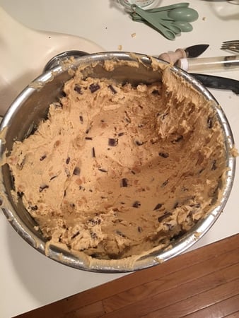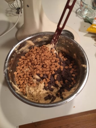 Add chocolate chunks and peanut butter morsels. Stir to just combine.