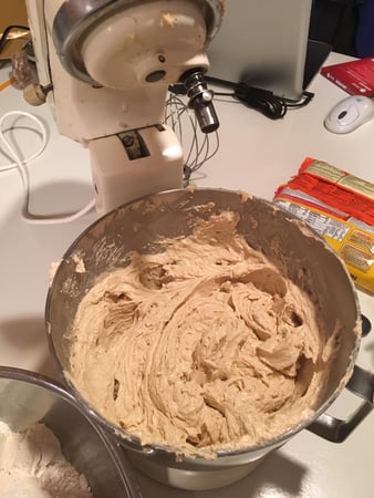 Add the eggs, one at a time. Beat after each addition until the mix is light and fluffy, scrape down the sides and bottom of the bowl after each egg addition.