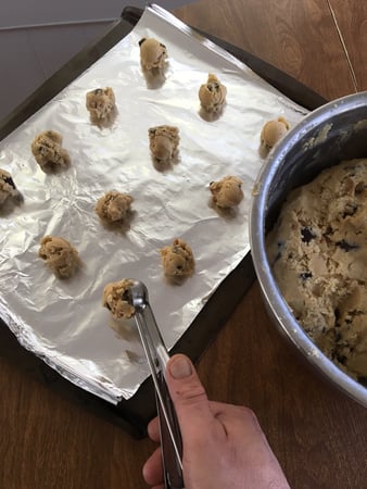 Using a 1 ounce scoop, portion the dough onto a cookie sheet lined with parchment paper or aluminum foil, keeping them about 3 inches apart.