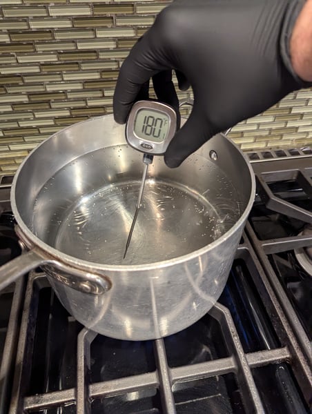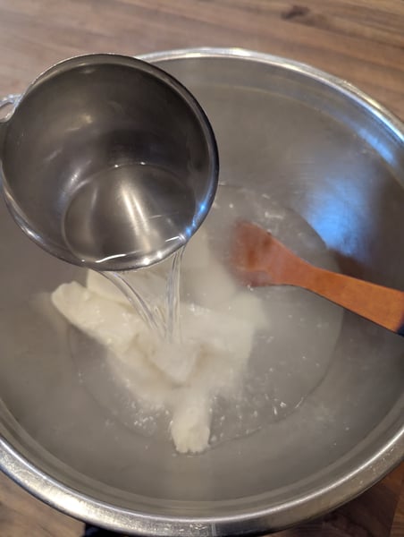 1. We begin by heating water on the stovetop in a pan. Our target is 180 degrees Fahrenheit. This is going to be what transforms our lumpy curd into our silky Mozzarella.