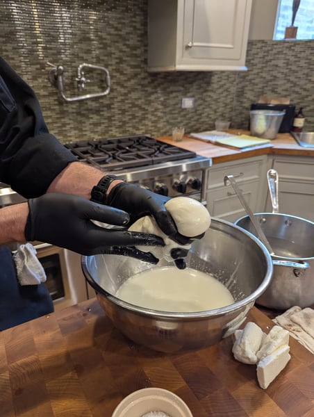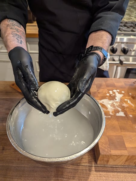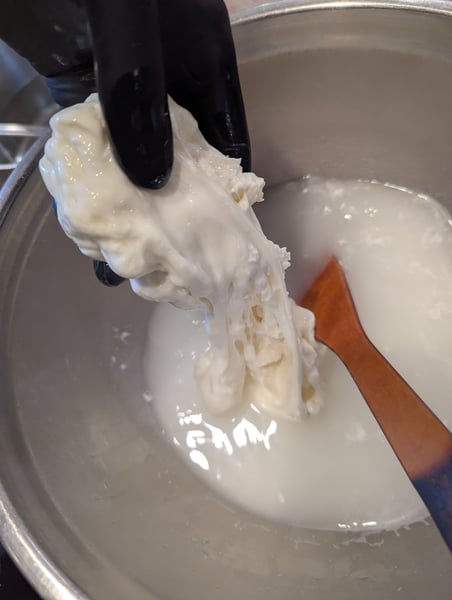 5. As the curd begins to melt together into a solid mass, we continue to gently stir, stretch, and fold until it is heated through and workable. Add more hot water if this isn’t happening in the first 30-90 seconds of working the curd in the hot water. Using a spoon is fine if the water feels too hot, though it does cool as it melts the curd, and you’ll find that with gloved hands it quickly gets to the point at which you can work it with your hands, dipping into the water and gently stretching and folding as you go to keep it warm and malleable.