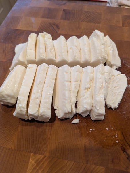 2. As the water is heating, we can slice our curd. We are simply looking for manageable sized pieces, and to expose more surface area of the curd to the hot water in order to help shape it. I cut my curd into 1/4 to 1/2-inch slices, and then in half down the middle.
