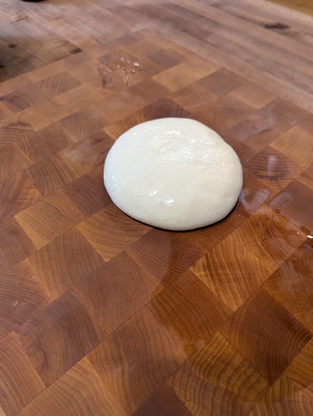 7. When you’ve shaped all your curd (relatively quickly to avoid any cooling and reheating), and the shaped pieces are cooled enough to hold their shape, you can remove them from the cool water. From here you can use them right away, or store them in the refrigerator in cool water, or dry, for later use. Whatever you do, do not resist the urge to sprinkle a still-warm piece with salt and olive oil and taste the fruits of your labor.