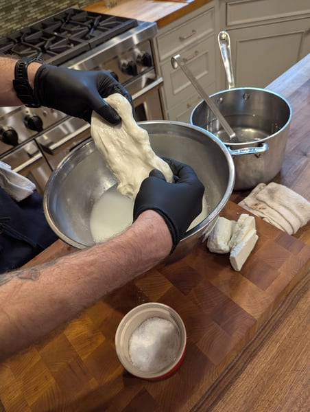 4. When we’re ready (a double layer of disposable gloves helps here), we begin ladling the hot water over the curd pieces gently until they are just covered, and begin stirring and folding them over one another gently as the water melts the curd. At this point, I will also add a couple large pinches of salt to help lightly season the finished product.