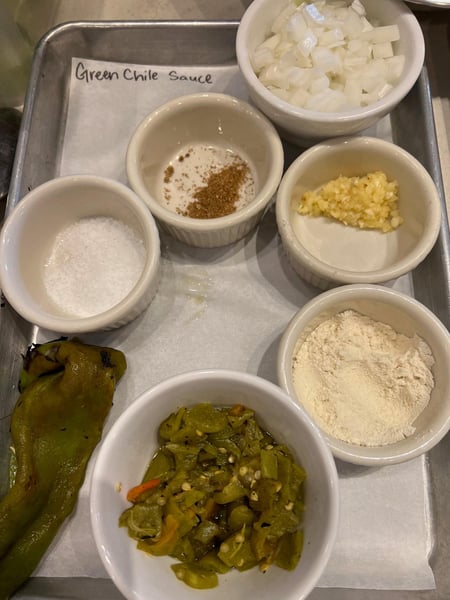 Other than roasting of peppers and vegetables, only one sauce had to cook on the stove, the Green Chile Sauce. Chef Allen said this particular recipe has a French influence since it is thickened with flour. However, we used masa harina instead, which is very finely ground corn. It's so fine it has the consistency of powder and is used for making corn tortillas, tamales and many other Latin American dishes. Chef Noe used it to make our tortilla dough.