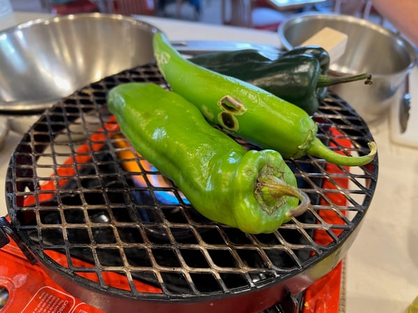 This class was part lecture about chiles and then part hands-on cooking. I love a good demonstration class so I especially enjoyed learning more about the green chile and equipment like the asado, which is basically a cage placed over an open flame that is used to roast chiles. The school has theirs custom made for them that fit over stovetop burners as well as portable gas burners, which is what we used during the class. Without an asado, you achieve the same char on vegetables using a grill or even your oven's broiler.