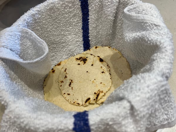 As the tortillas were cooked, we placed them in a basket lined with a kitchen towel to keep them warm.
